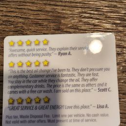 Oilstop is unlike all other drive-thru oil change businesses. This is immediately evident when upon arrival you are greeted with friendly employees who guide you into a bay and offer you a complimentary chilled beverage of your choice. They are not commissioned and they do not pressure any services onto you. Whatever services you do agree to, the products used and worked performed will be quality. Sign up for emails and you will occasionally receive valuable coupons. I drive many miles to come to Oilstop for a reason - no other drive-thru oil change company can match their professionalism, quality, trustworthiness, and value. Highly recommend!